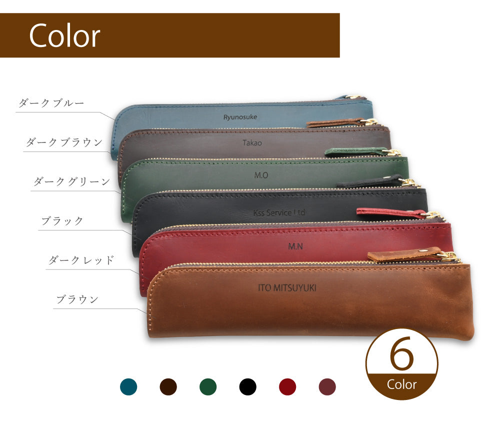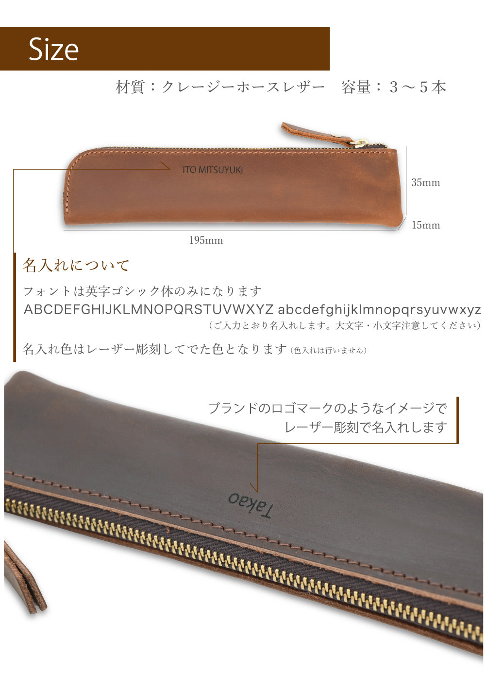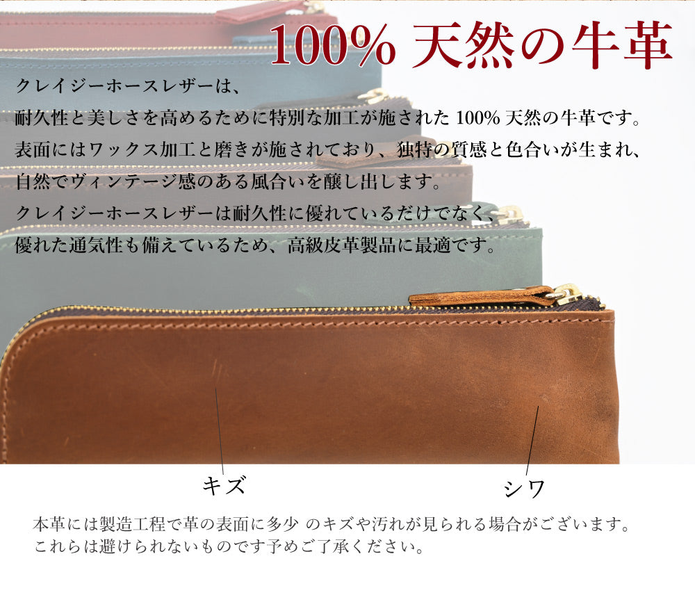 しっとりとした質感と、使い込むほどに深まる風合いが魅力のクレイジーホースレザー ペンケース。